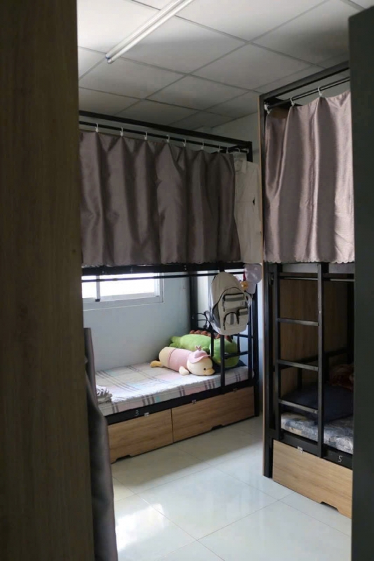 7. Nội thất phòng:máy lạnh, tủ quần áo, giường nệm, tủ kệ 8. Thông tin ktx Trang bị giường nệm rèm , Thanh móc đồ và bàn học gấp tiện lợi