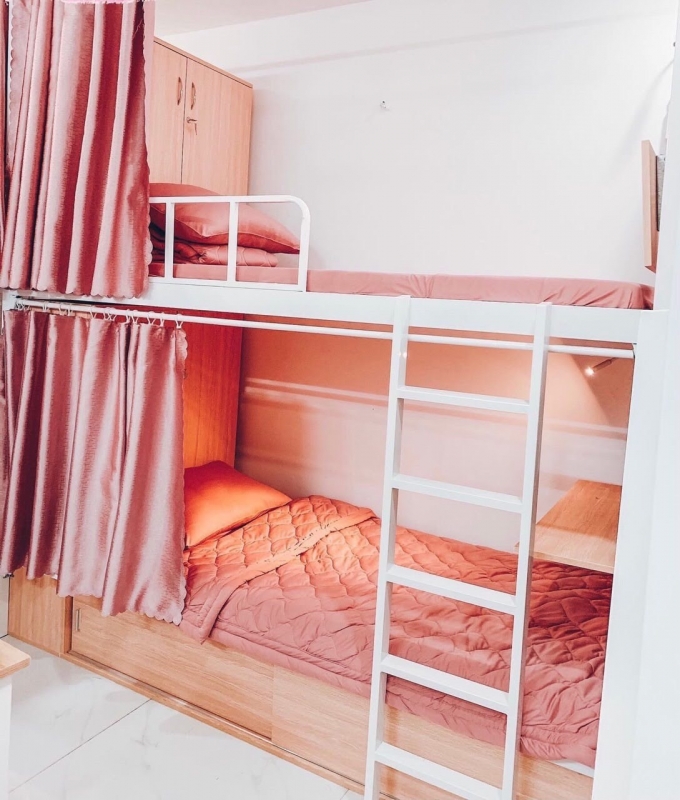 - Nội thất cao cấp mới tinh: Giường tầng chắc chắn, tủ gỗ riêng mỗi giuờng,rèm che riêng tư, chăn ga gối nệm cao cấp, tủ giày, máy lạnh, quạt, tủ lạnh, máy giặt, thiết bị vệ sinh, kệ bếp, bếp từ...